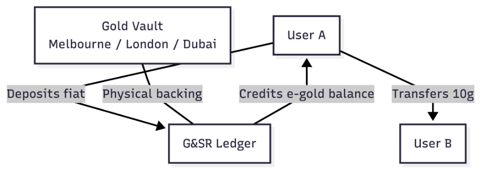 Transaction flow: User A deposits $1,000 via bank transfer. G&SR converts it to 25 grams of e-gold at market price, crediting User A’s account. User A transfers 10 grams to User B via the web interface. The ledger updates instantly: A decreases by 10g, B increases by 10g. No clearing house, no multi-day delay, no third-party approval. Once confirmed, transactions could not be reversed, achieving finality in seconds rather than the T+1 to T+3 clearing cycles of traditional banking.
