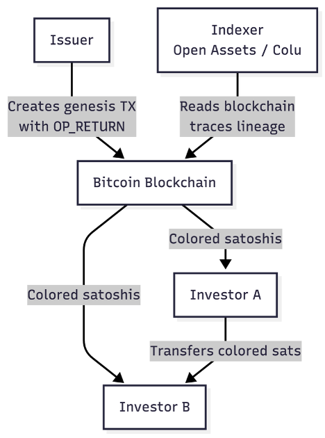 Transaction flow: A stock issuer creates a genesis transaction with OP_RETURN data encoding asset metadata. This output becomes the canonical color source. The issuer transfers colored satoshis to investor addresses (e.g., 100 satoshis = 100 shares). Colored Coins indexers observe the Bitcoin blockchain and trace satoshi lineage back to genesis, crediting investors with share ownership. Any participant can download the ledger and verify the entire chain of title by replaying transactions.