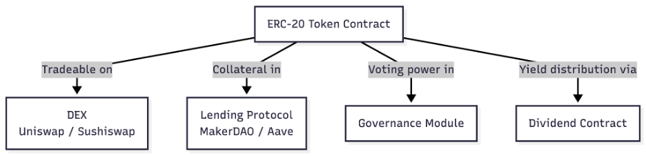 The ERC-20 standard itself was unremarkable in isolation (a handful of function signatures), but the interoperability it unlocked was extraordinary. Every new token launched was immediately tradable on every DEX, usable as collateral in all lending protocols, and visible in all wallets. That network effect is what the Colored Coins era lacked, and it is what made Ethereum the default platform for tokenized assets.