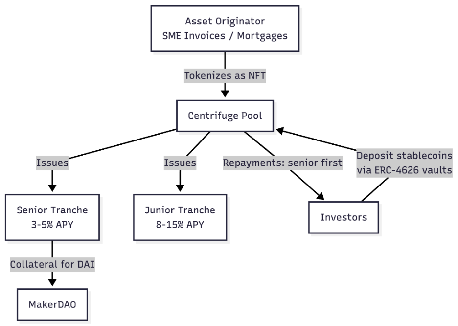 Transaction flow (invoice financing): An SME with $100,000 in outstanding invoices uploads them to Centrifuge with off-chain legal agreements. A smart contract issues an NFT that represents the invoice pool. The SME opens a pool with senior ($80,000) and junior ($20,000) tranches. DeFi investors deposit stablecoins into the pool via ERC-4626 vaults; the pool mints tranche tokens accordingly. As the SME’s customers pay invoices over 30-90 days, the smart contract distributes proceeds: senior holders receive priority repayment, junior holders receive the remainder.