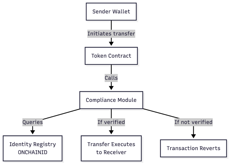 - Transfer flow: sender initiates transfer; smart contract calls Compliance Module; module queries Identity Registry; if approved, transfer executes; otherwise, transaction reverts.